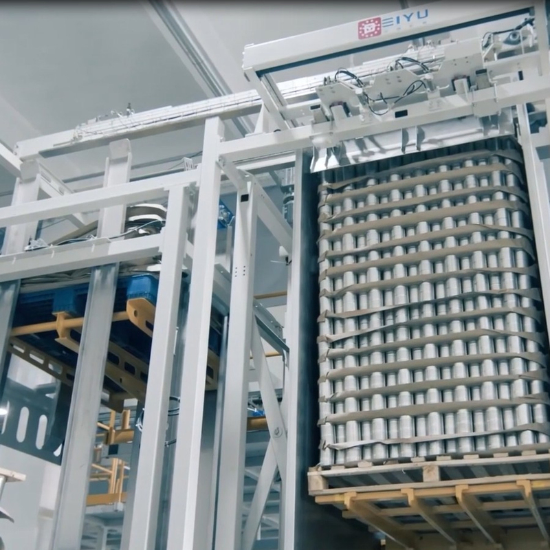This system is suitable for palletizing and depalletizing empty cans. It is mainly composed of empty cans palletizer, depalletizer, and empty cans conveyer system. The lifting system uses hydraulic drive. The parallel shift of the cans is clamping and shifting way by synchronous belt drive.